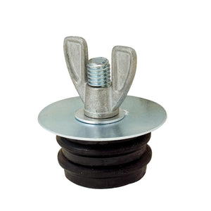 Expansion plug to use for testing or as temporary pipe plug, steel flange plates. Large wing nut for easy tightening. Molded rubber gasket to seal all types of pipe.